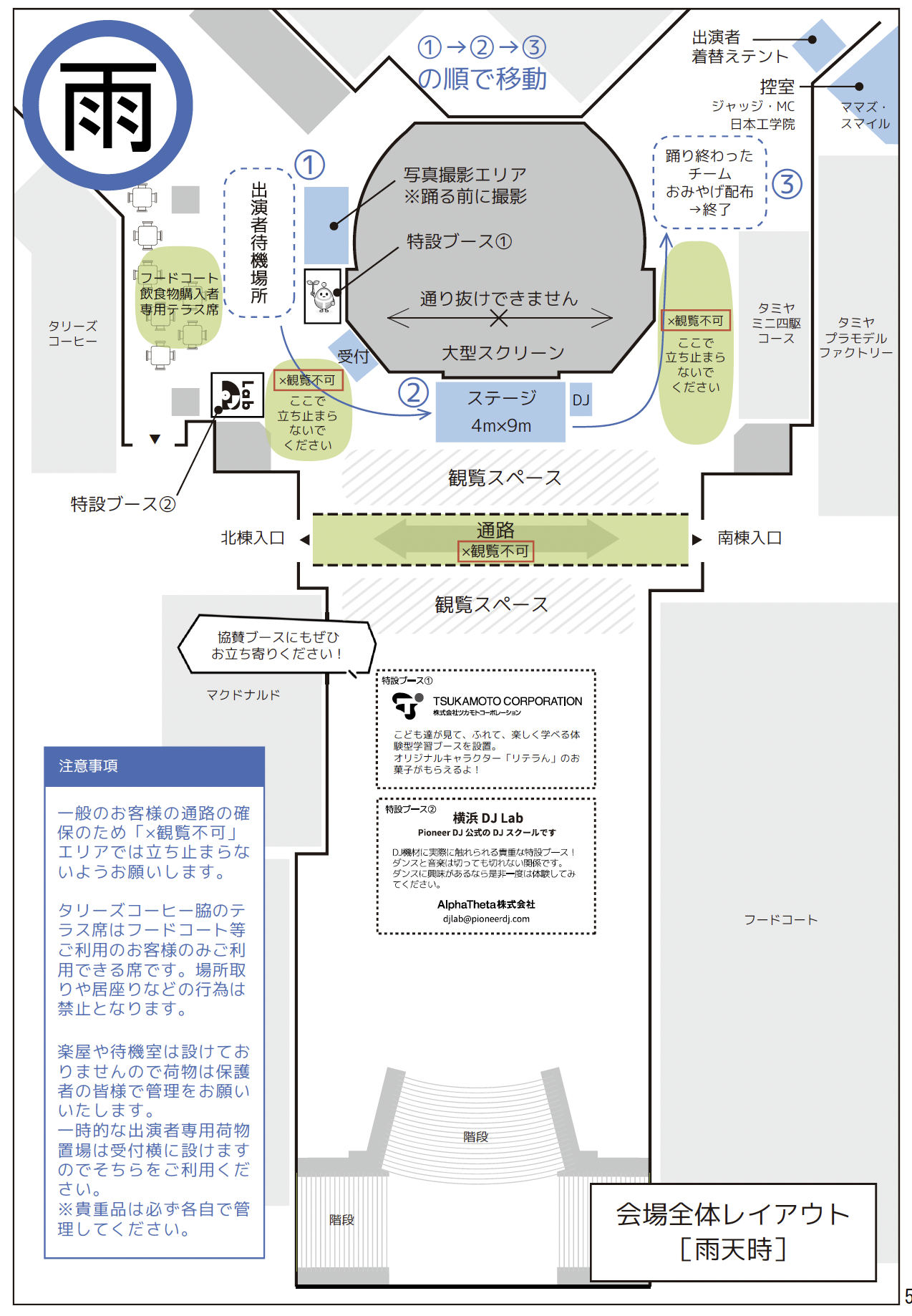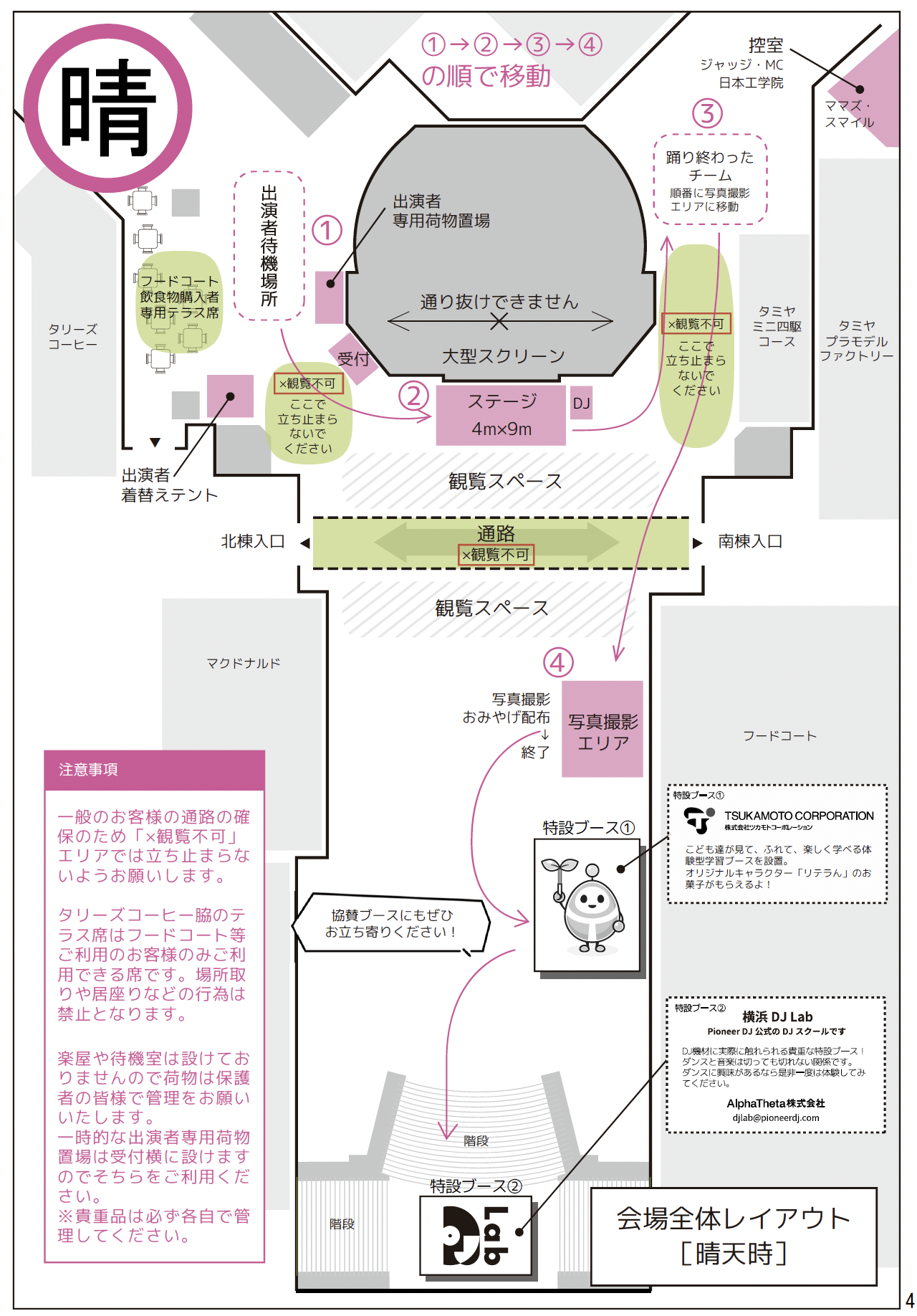 ・会場付近はイベントを観覧されるお客様以外にもお買い物をされるお客様や通行されるお客様が多くいらっしゃいますのでそういった方々の妨げにならないようお配慮をお願いいたします。